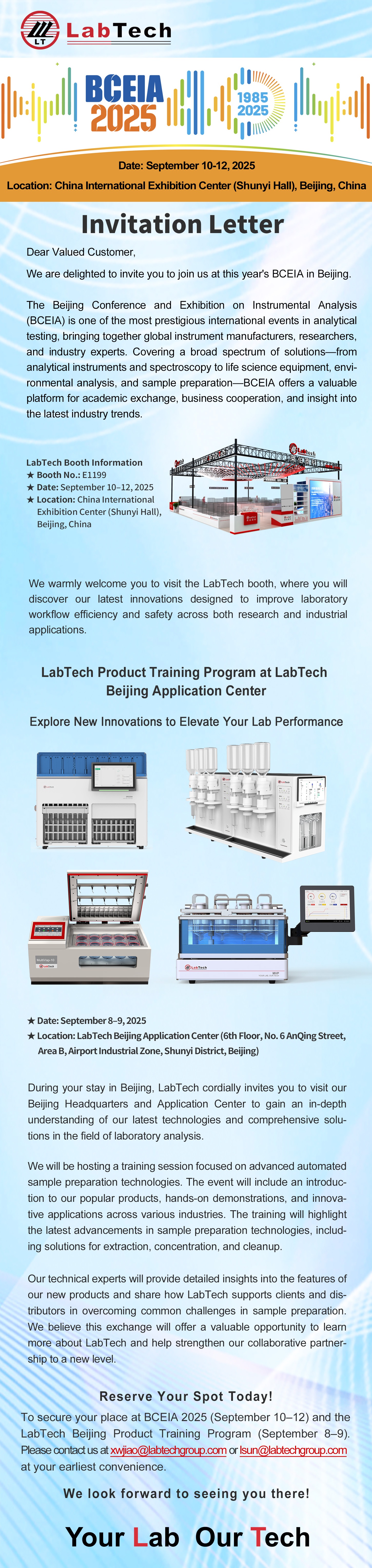To secure your place at BCEIA 2025 and the LabTech Beijing Product Training Program, please contact us at info@labtechworld.com at your earliest convenience.