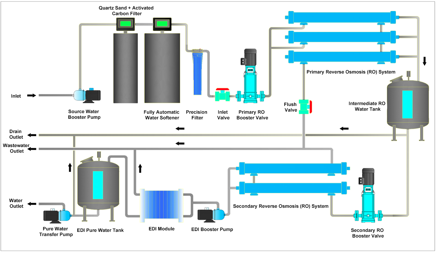 To prevent stagnant water from forming in the pipelines, the system is designed as a circulating pipeline network, featuring both ultrapure water supply and return lines to ensure continuous water flow and maintain water quality.