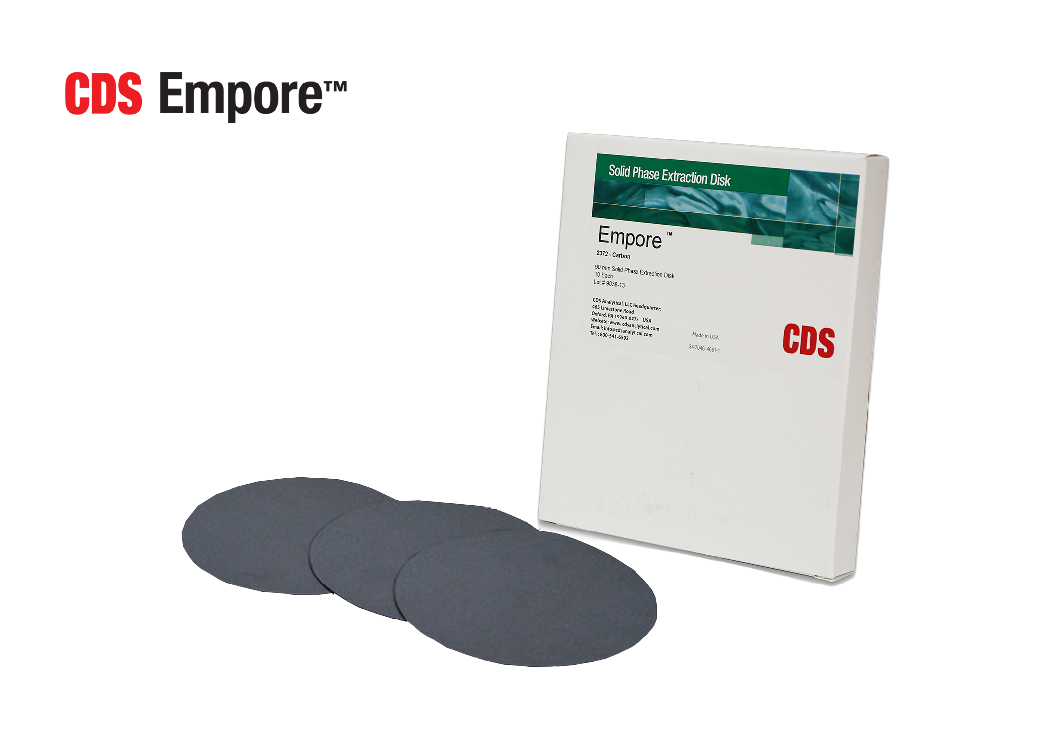 CDS Empore 2272 and 2372 Environmental Carbon Disks are solid phase extraction (SPE) disks made with activated carbon and a 12 μm particle size. The carbon surface contains both positive and negative charges, allowing effective extraction of highly polar compounds such as N-nitrosodimethylamine, oxamyl, and methamidophos, as well as volatile compounds like trihalomethanes. These disks are ideal for environmental and drinking water sample preparation.