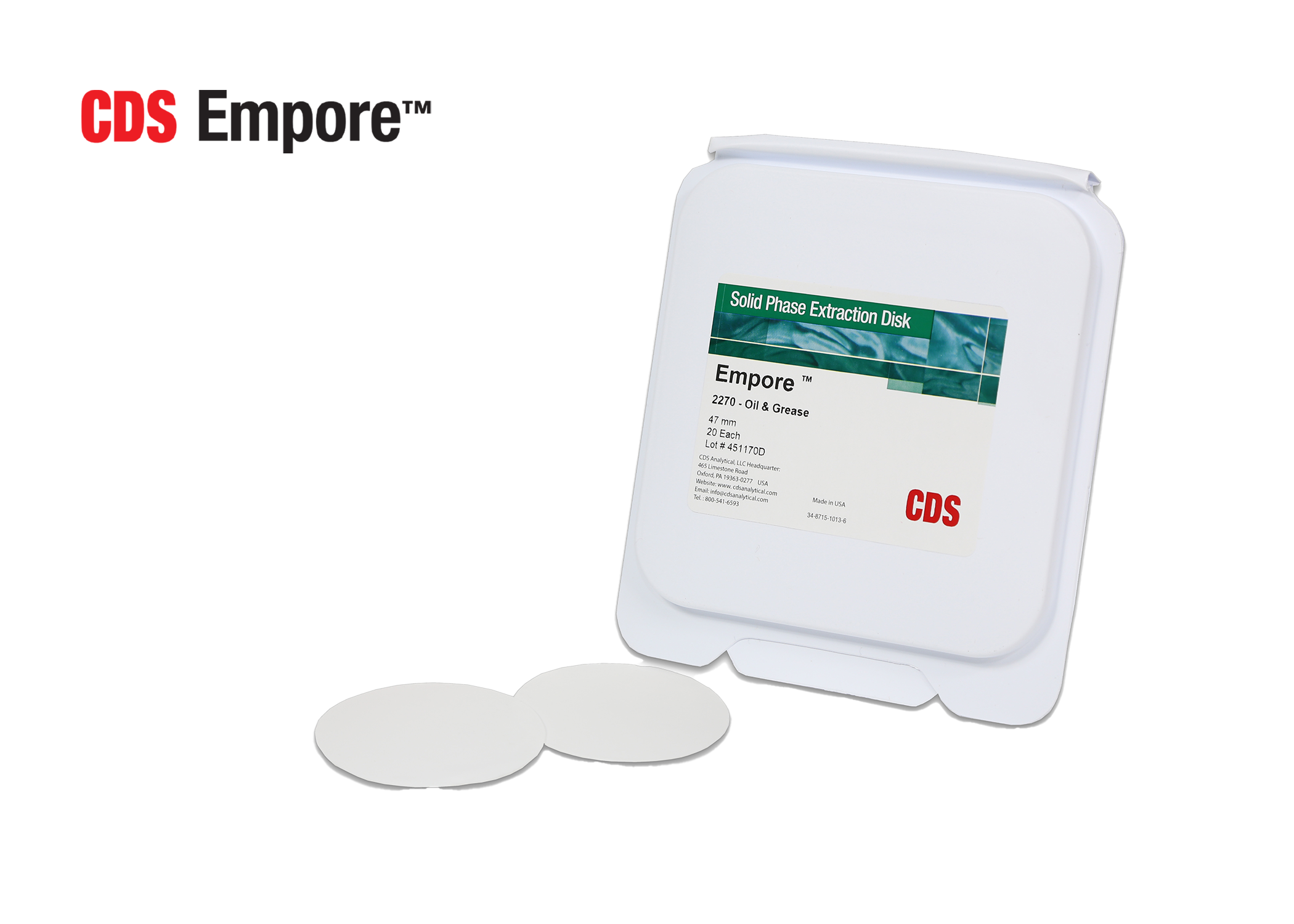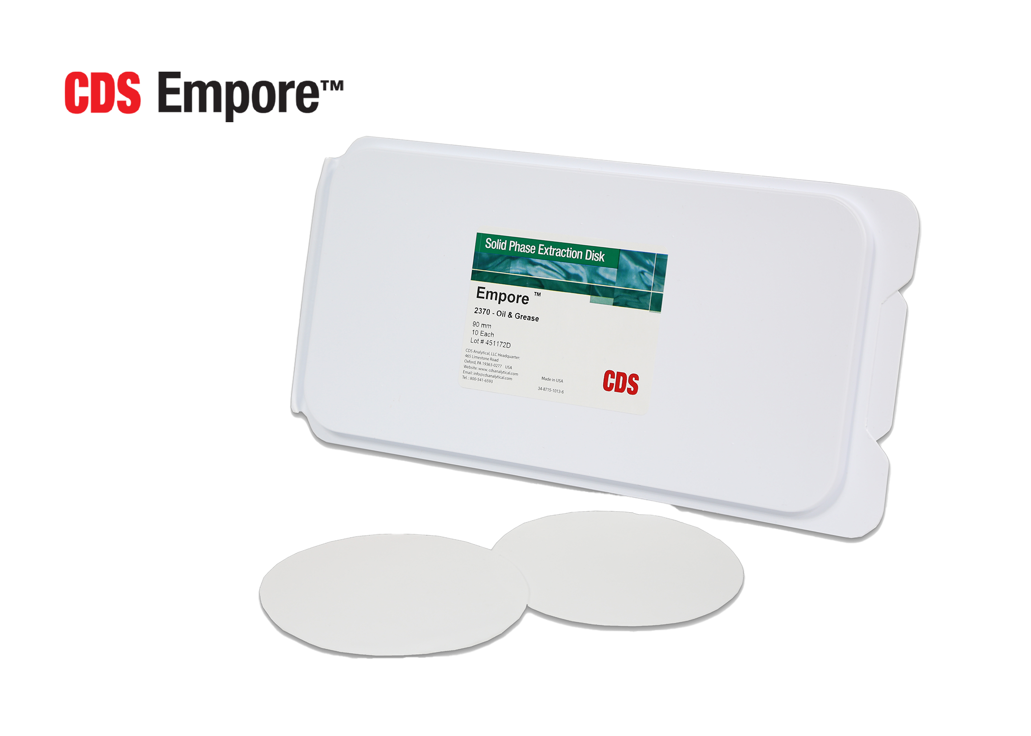 CDS Empore 2270/2370 Oil & Grease Disks feature a one-piece design composed of C18 bonded silica beads and a depth filter. This integrated structure eliminates the need for additional prefilters and filter aids. These solid phase extraction (SPE) disks enable contamination-free extractions, provide up to 90% solvent reduction, and ensure fast flow rates with accurate and reproducible results. Suitable for EPA Method 1664 oil and grease analysis in water and wastewater.