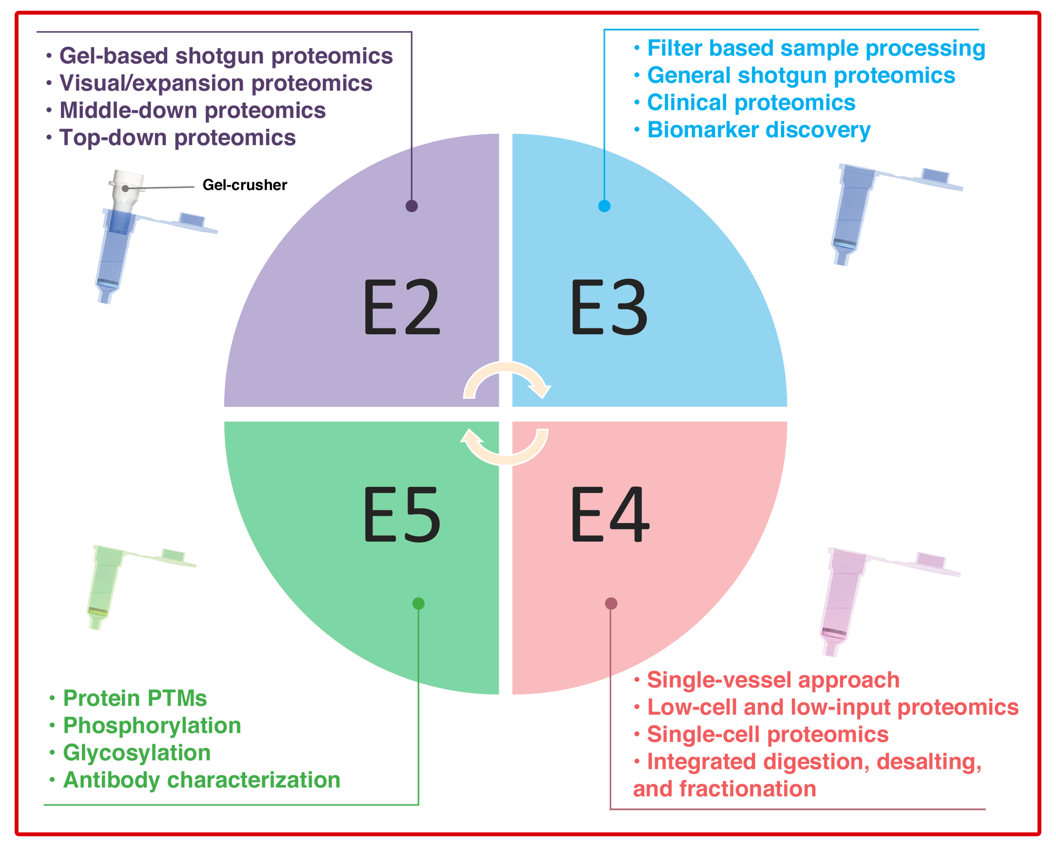E4Technology™ is designed to prepare LCMS-ready samples in an unprecedented manner. The high efficiency and effectiveness along with versatility and low cost make it ideal for processing protein samples for basic research, clinical screening, and large-scale biomarker discovery. The “single vessel” nature of the technology also holds great value for “ultra-low-input” proteomics.